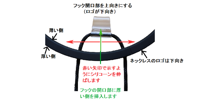 図1.のように赤い矢印方向にシリコーンネックレスを伸ばし、緑の矢印方向にネックレスの薄い面をはめ込みます。 接続されると図2.のようになります。
